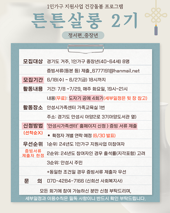 [아이뉴스24 임정규 기자] 경기도 안성시가족센터가 중장년 1인가구의 건강한 삶을 돕기 위한 ‘튼튼살롱 2기’ 참여자를 모집한다고 18일 밝혔다.