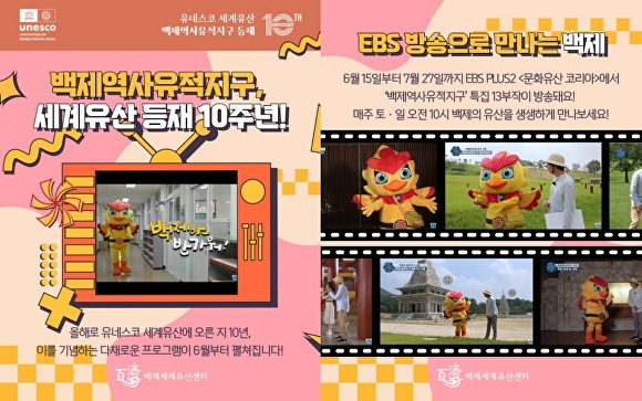 우선, EBS PLUS2 '문화유산 코리아'를 통해 7월 27일까지 매주 주말 오전 10시에 백제역사유적지구를 주제로 한 13부작이 방송된다. 7월 6일 오후 3시 45분에는 EBS 1TV에서 백제역사유적지구 10주년 특집 다큐멘터리도 방영될 예정이다.