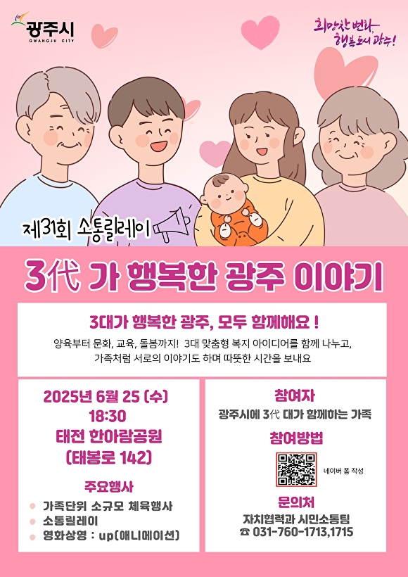 [아이뉴스24 정재수 기자] 경기도 광주시는 오는 25일 태전동 한아람공원에서 세대 간 공감과 가족 간의 정을 되새기는 ‘제31회 소통릴레이:3代가 행복한 광주이야기’를 개최한다고 19일 밝혔다.
