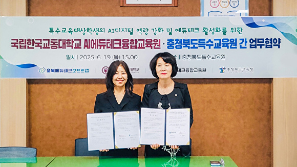 [아이뉴스24 윤재원 기자] 국립한국교통대학교 AI에듀테크융합교육원(원장 김인숙)과 충북특수교육원(원장 최명옥)은 특수교육대상 학생의 AI(인공지능) 디지털 역량 강화와 디지털 포용 미래교육 협력체계 구축을 위한 업무협약을 했다고 20일 밝혔다.