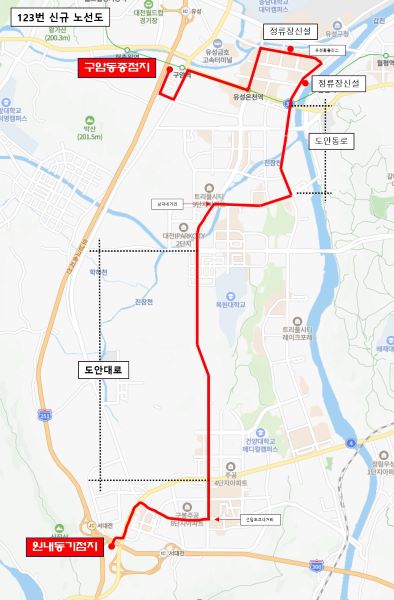 우선 새롭게 신설되는 123번 노선은 원내동에서 출발해 도안대로와 도안동로를 거쳐 유성구 구암역까지 연결된다. 이 노선은 기존에 시내버스가 한 번도 운행하지 않았던 도안대로, 온천동로, 문화원로를 처음 경유하는 노선으로, 특히 서구 관저동과 유성구 구암역을 연결하는 대중교통망의 공백을 해소할 것으로 기대된다.