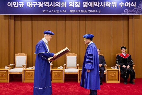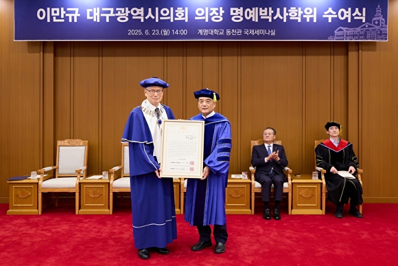 [아이뉴스24 이창재 기자] 이만규 대구시의회 의장이 23일 계명대학교 성서캠퍼스 동천관에서 열린 학위 수여식에서 명예문학박사 학위를 받았다. 이날 행사에는 지역 국회의원과 각계 주요 인사들이 참석해 자리를 빛냈다.