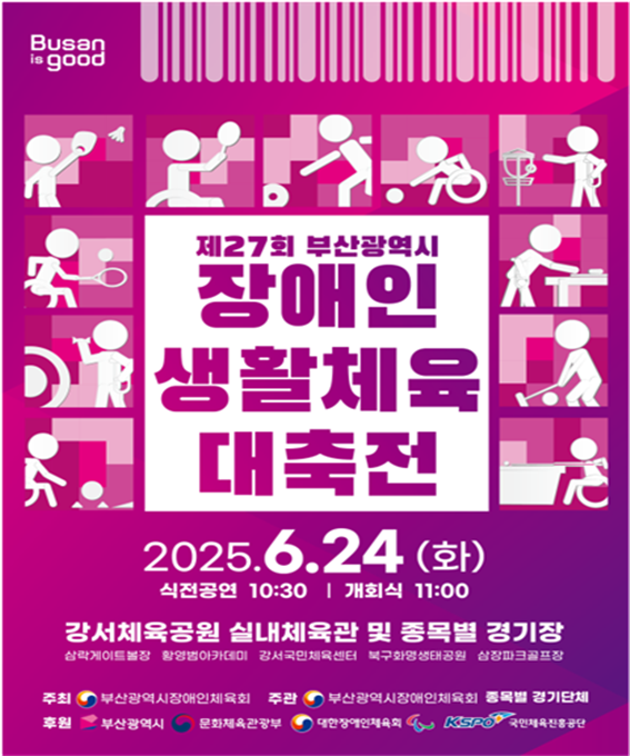 [아이뉴스24 정예진 기자] 부산광역시가 24일부터 오는 30일까지 강서체육공원, 사직 론볼경기장 등 6곳의 경기장에서 ‘제27회 부산광역시 장애인생활체육대축전’을 개최한다.