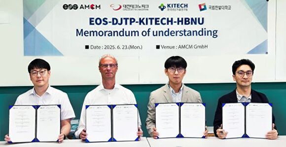 [아이뉴스24 강일 기자] 대전테크노파크는 지난 23일(현지시각) 독일 뮌헨에서 글로벌 금속 3D프린팅 선도기업인 독일 EOS AMCM, 한국생산기술연구원, 국립한밭대학교와 3D프린팅 기술협력을 위한 4자간 업무협약(MOU)을 체결했다고 25일 밝혔다.