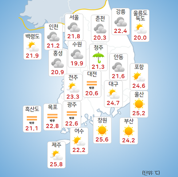 부산지방기상청에 따르면 이날 오전 9시 현재 주요 지역의 기온은 부산 24.2도, 울산 25.2도, 창원 25.6도로 기록됐다.