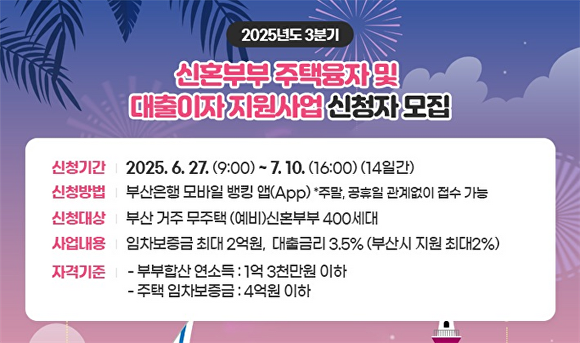 [아이뉴스24 정예진 기자] 부산광역시가 무주택 신혼부부의 주거비 부담을 덜기 위해 ‘2025년 3분기 신혼부부 주택융자 및 대출이자 지원사업’ 대상자 400세대를 오는 27일부터 내달 10일까지 모집한다.