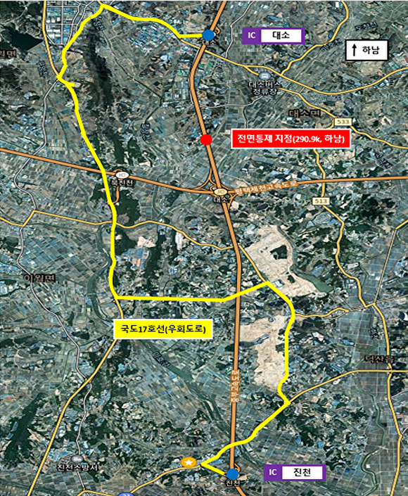통제 시간대 진천IC에서 대소IC까지 하남 방향 이용 차량은 중부고속도로 진천IC에서 진출 후, 국도 17호선으로 우회해 대소IC로 재진입할 수 있다.