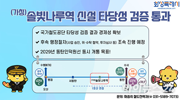 [아이뉴스24 김장중 기자] 경기도 화성특례시는 ‘(가칭) 솔빛나루역’ 신설 사업이 국가철도공단(공단)의 타당성 검증을 통과해, 본격적인 추진 동력을 얻게 됐다고 밝혔다.
