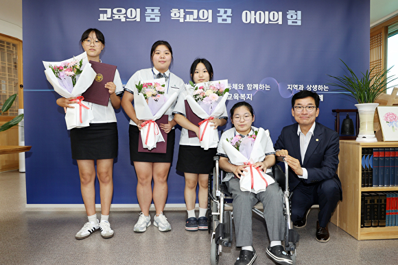 충북도교육청은 휠체어를 이용하는 박지수 양과 함께하며 따뜻한 배려를 실천한 박지민·안수영·신민정 등 청주여상 학생들의 선행에 감명받아, 30일 이들 학생에게 윤건영 교육감 명의의 ‘장애공감문화조성 유공 학생 표창’을 수여했다.