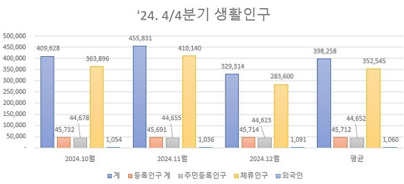 해당 기간 군의 평균 생활인구는 39만 8,258명으로, 이 중 체류인구는 35만2,545명, 등록인구(주민등록+외국인등록)는 4만5,712명으로 나타났다.
