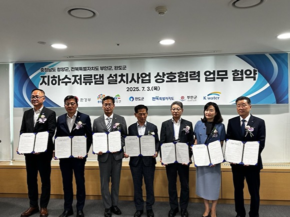[아이뉴스24 박종수 기자] 전북자치도 부안군은 3일 서울 양재동 aT센터에서 환경부, 전북특별자치도, 한국수자원공사와 함께 위도 깊은금 지하수저류댐 설치사업 추진을 위한 4자 협약을 체결했다.