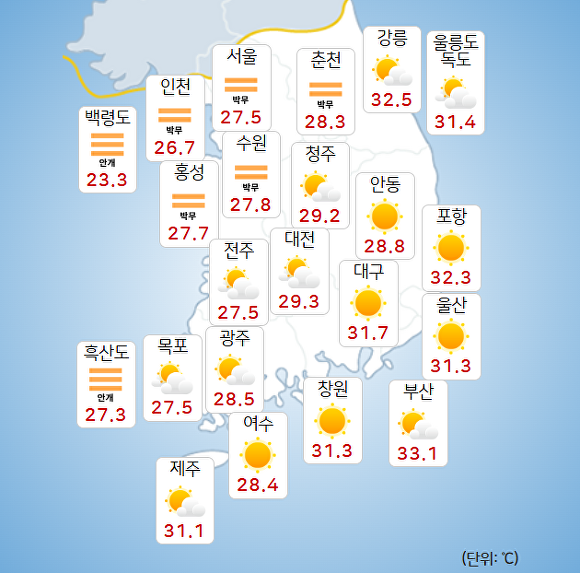 부산지방기상청에 따르면 이날 오전 9시 현재 주요 지역의 기온은 부산 33.1도, 울산 31.3도, 창원 31.3도로 기록됐다.