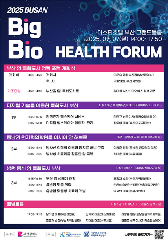 [아이뉴스24 정예진 기자] 부산광역시가 7일 오후 2시 아스티호텔 부산 그랜드볼룸에서 ‘2025 빅(BIG) 바이오헬스 포럼’을 개최한다.