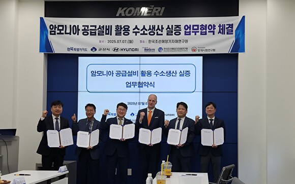 전북자치도와 군산시는 7일 군산시 오식도동에 위치한 한국조선해양기자재연구원에서 한국조선해양기자재연구원, 현대자동차, 현대로템, 방재시험연구원과 함께 '암모니아를 활용한 수소생산 시스템 구축'을 위한 업무협약(MOU)을 체결했다.