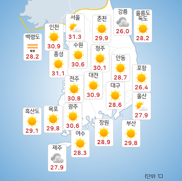 부산지방기상청에 따르면 이날 오전 9시 현재 주요 지역의 기온은 부산 29.8도, 울산 27.9도, 창원 28.9도로 기록됐다.