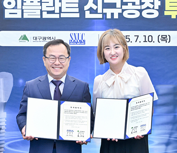 [아이뉴스24 이창재 기자] 대구시는 10일 산격청사에서 글로벌 강소기업 ㈜스누콘(대표 박영우)과 임플란트 전용 신규공장 2개소 건립을 위한 투자협약을 체결했다고 밝혔다.