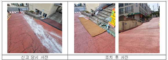 올해 상반기 최우수 신고 사례는 중구의 한 주택가 급경사지에 야자매트와 미끄럼 방지 포장을 제안한 것이다. 겨울철 결빙으로 인한 보행자 낙상 사고 발생 위험을 사전에 막은 공로를 인정받았다.