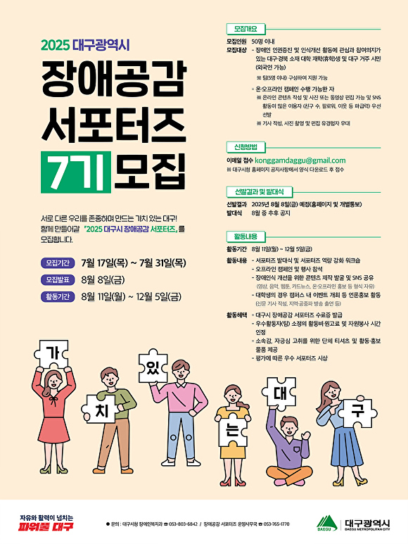 [아이뉴스24 이창재 기자] 대구시는 장애에 대한 올바른 인식을 확산하고 다양한 개성이 존중받는 인권공동체 조성을 위해 ‘제7기 대구시 장애공감 서포터즈’를 오는 17일부터 31일까지 공개 모집한다고 16일 밝혔다.