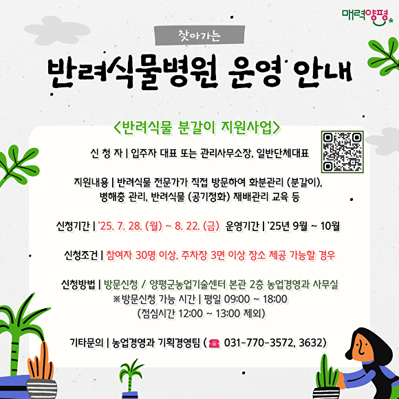 [아이뉴스24 이윤 기자] 경기도 양평군은 오는 9월부터 10월까지 공동주택 입주민과 지역 단체를 대상으로 ‘찾아가는 반려 식물 병원’ 프로그램을 운영한다.