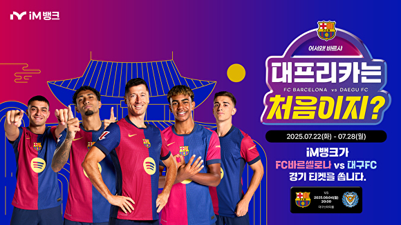 [아이뉴스24 이창재 기자] iM뱅크(아이엠뱅크, 은행장 황병우)는 오는 8월 4일 대구스타디움에서 열리는 FC바르셀로나와 대구FC의 친선경기 입장권을 추첨 증정하는 ‘바르샤 어서와! 대프리카는 처음이지?’ 이벤트를 실시한다고 22일 밝혔다.