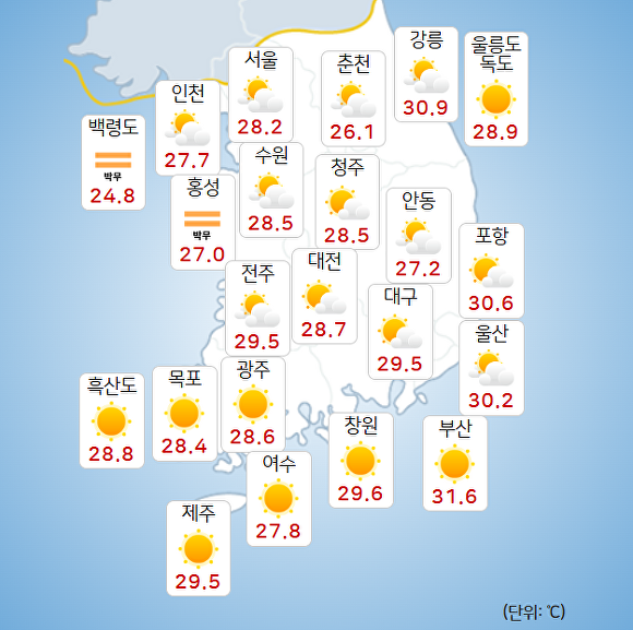 부산지방기상청에 따르면 이날 오전 9시 현재 주요 지역의 기온은 부산 31.6도, 울산 30.2도, 창원 29.6도로 기록됐다.