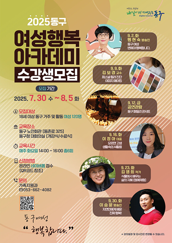 [아이뉴스24 이창재 기자] 대구 동구청(구청장 윤석준)은 여성의 자기계발과 역량 강화를 위한 ‘2025년 동구 여성행복아카데미’ 수강생을 오는 30일부터 8월 5일까지 모집한다고 23일 밝혔다.