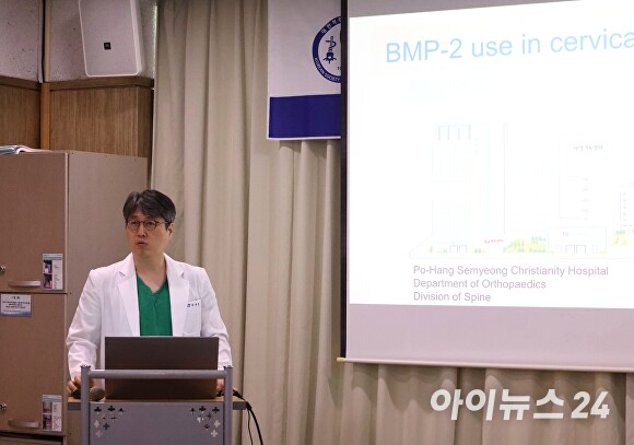 어재형 부장은 'BMP-2 use on the cervical spine surgery(경추 수술에서의 BMP-2 사용)'를 주제로, BMP-2를 활용한 경추 유합술 및 척추 안정화 수술의 임상 적용과 최신 연구 동향을 발표했다.
