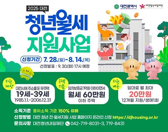 [아이뉴스24 강일 기자] 대전시는 오는 28일 오전 9시부터 8월 14일 오후 6시까지 ‘대전 청년월세 지원사업’의 신청자를 모집한다. 이 사업은 청년들의 주거비 부담을 줄이기 위해 월 20만원씩 최대 12개월간 총 3000명에게 월세를 지원한다.