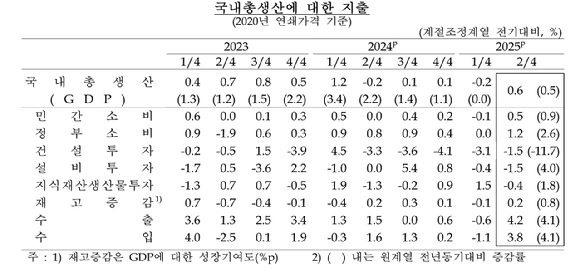 24일 한은은 2분기 실질 국내총생산(GDP) 성장률(직전 분기 대비·속보치)이 0.6%로 집계됐다고 발표했다. 소수점 둘째 자리까지 보면 0.61%다. 지난 2024년 1분기(1.2%) 이후 최대 성장 폭이다. 한은이 지난 5월 경제 전망에서 예상했던 성장률(0.5%)도 웃돌았다.