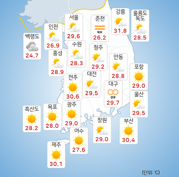 부산지방기상청에 따르면 이날 오전 9시 현재 주요 지역의 기온은 부산 30.4도, 울산 29.5도, 창원 29도로 기록됐다.
