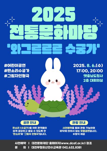 8월 6일 충남도청사 2층 대회의실에서는 판소리 그림자 인형극 ‘와그르르르 수궁가’공연이 진행된다. 수궁가를 어린 관객들이 이해하기 쉽게 관람할 수 있도록 판소리의 구절과 대사를 알기 쉬운 말로 구성하여 제작한 공연으로 사전예약을 통해 관람이 가능하다.