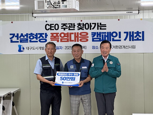 [아이뉴스24 이창재 기자] 대구도시개발공사(사장 정명섭)는 지난 24일 복현 주거환경개선사업 건설현장에서 ‘CEO 주관 찾아가는 건설현장 폭염대응 캠페인’을 실시하며 근로자 안전 강화에 나섰다.