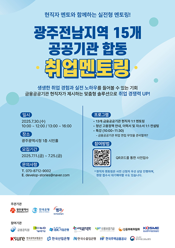 [아이뉴스24 한봉수 기자] 광주광역시는 지역 청년들의 금융공공기관 취업을 지원하기 위한 ‘광주전남지역 공공기관 합동 취업멘토링’ 행사를 30일 시청 시민홀에서 개최한다고 밝혔다.
