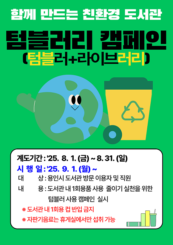 도서관에 일회용컵 반입을 제한하고 개인 터블러 등 다회용기 사용을 권장하는 캠페인이다.