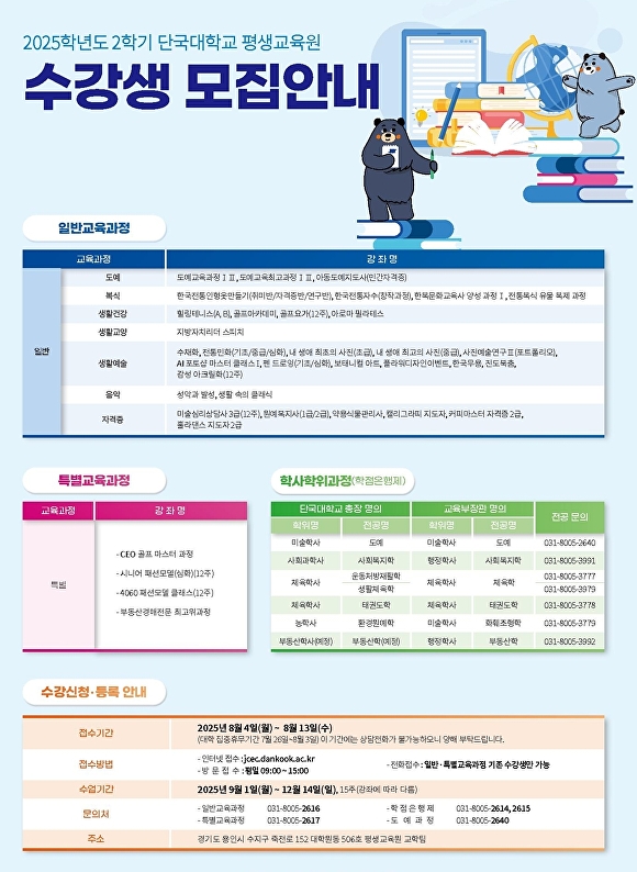 강의는 오는 9월 1일부터 12월 14일까지 죽전캠퍼스에서 진행되며 총 15주로 구성됐다. 원서접수는 4일부터 13일까지다. 접수는 평생교육원 홈페이지(jcec.dankook.ac.kr) 또는 방문을 통해 가능하다.