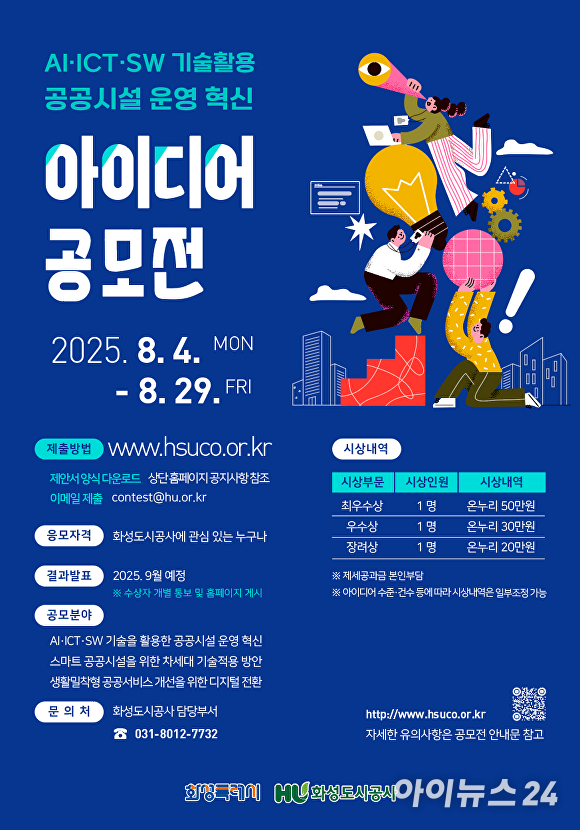 [아이뉴스24 김장중 기자] 경기도 화성도시공사(HU공사)가 오는 29일까지 ‘AI·ICT·SW 기술을 활용한 공공시설 운영 혁신 아이디어 공모전’을 개최한다.