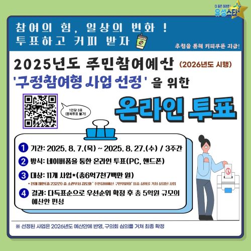 투표 참여는 유성구 홈페이지에 게시된 배너의 QR코드를 통해 가능하며, 1인당 3개의 사업에 투표할 수 있다. 유성구민이면 누구나 참여할 수 있으며 투표에 참여한 주민을 대상으로 추첨을 통해 커피 쿠폰을 증정하는 이벤트도 함께 진행된다.