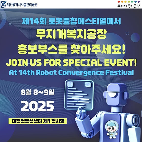 [아이뉴스24 김천겸 기자] 대전시설관리공단은 8~9일 대전컨벤션센터에서 열리는 ‘제14회 로봇융합페스티벌’에 참여해 무지개복지공장 장애인생산품 홍보부스를 운영한다.