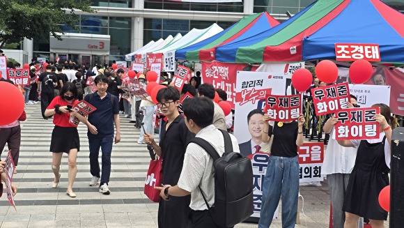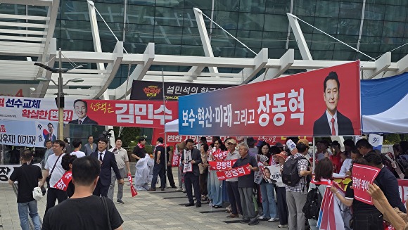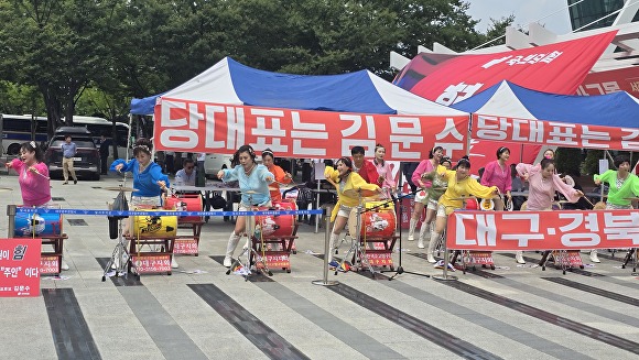 당대표 선거의 최대 격전지로 꼽히는 TK에서 김문수 후보 지지캠프는 엑스코 광장 두 곳에 부스를 설치, 오가는 당원들과 악수하며 ‘혁신과 단합’을 강조했다. 경쟁상대인 장동혁 후보 측도 피켓과 현수막을 앞세워 “변화와 쇄신”을 외치며 맞불을 놨다.