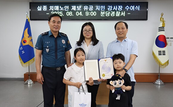 [아이뉴스24 정재수 기자] 분당경찰서(서장 정진관)는 지난 4일 서장실에서 실종경보 제도를 통해 ‘치매 노인’ 조기 발견에 기여한 임가은 씨에게 감사장을 수여했다.