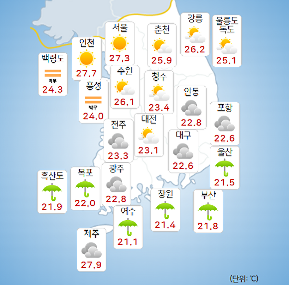 부산지방기상청에 따르면 이날 오전 9시 현재 주요 지역의 기온은 부산 21.8도, 울산 21.5도, 창원 21.4도로 기록됐다.