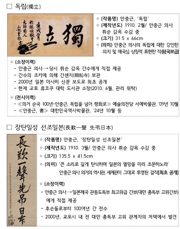 그동안 안 의사의 유묵과는 달리 '獨立(독립)', '長歎一聲 先弔日本(장탄일성 선조일본)'은 항일정신이 직접 투영된 작품으로, 그 가치를 국보급으로 평가하고 있다.