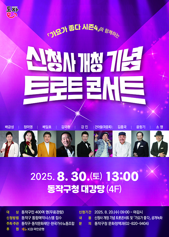 이번 행사는 45년 만의 신청사 이전을 구민과 함께 축하하고 세대가 공감할 수 있는 문화 향유 기회를 제공하고자 마련됐다. 동작구, 동작문화재단, 한국방송가수노동조합이 공동으로 주관하며 트로트 전문 방송 프로그램 ‘가요가 좋다 시즌 4’ 공개 녹화와 연계해 진행된다.