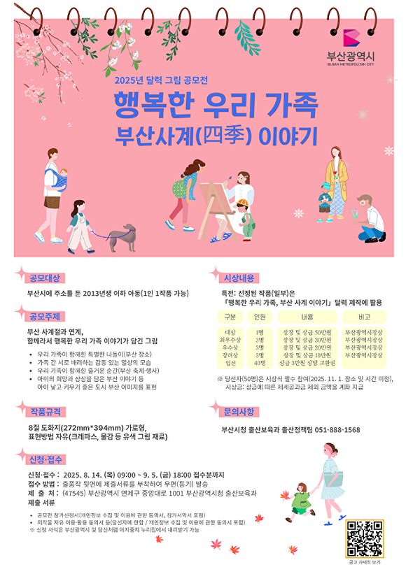 박설연 부산광역시 여성가족국장은 “시는 아이들이 행복하고 부모도 행복한 도시를 만들고자 관련 정책을 촘촘하게 발굴하고 있다”면서 “이번 공모전이 아이와 가족이 함께 부산의 아름다운 사계절 속 따뜻한 이야기를 담아내는 특별한 계기가 되기를 바란다”고 말했다.
