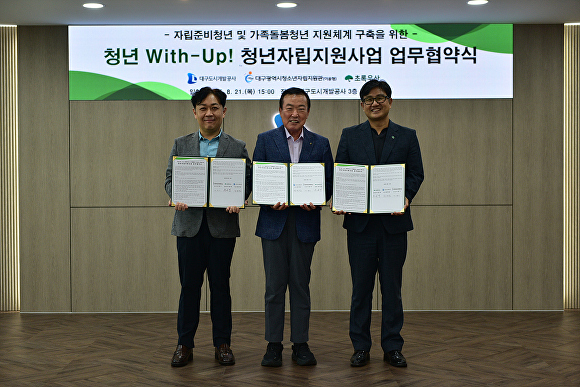 [아이뉴스24 이창재 기자] 대구도시개발공사(사장 정명섭)는 지난 21일 대구시청소년자립지원관, 초록우산 어린이재단 대구지역본부와 함께 자립준비청년 및 가족돌봄청년을 위한 지원체계 구축 협약을 체결했다.