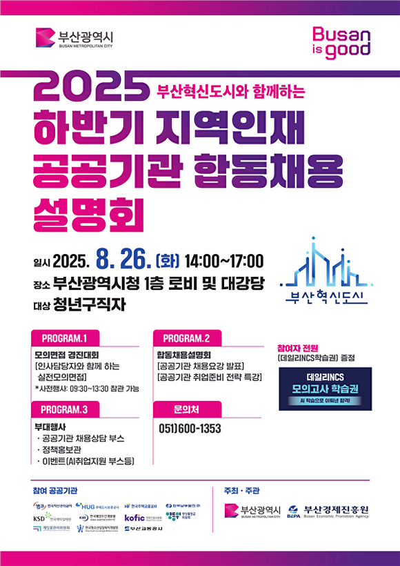 [아이뉴스24 정예진 기자] 부산광역시가 오는 26일 오후 2시 부산광역시청 대강당에서 부산 혁신도시와 함께하는 ‘2025 하반기 지역인재 공공기관 합동채용 설명회’를 개최한다.