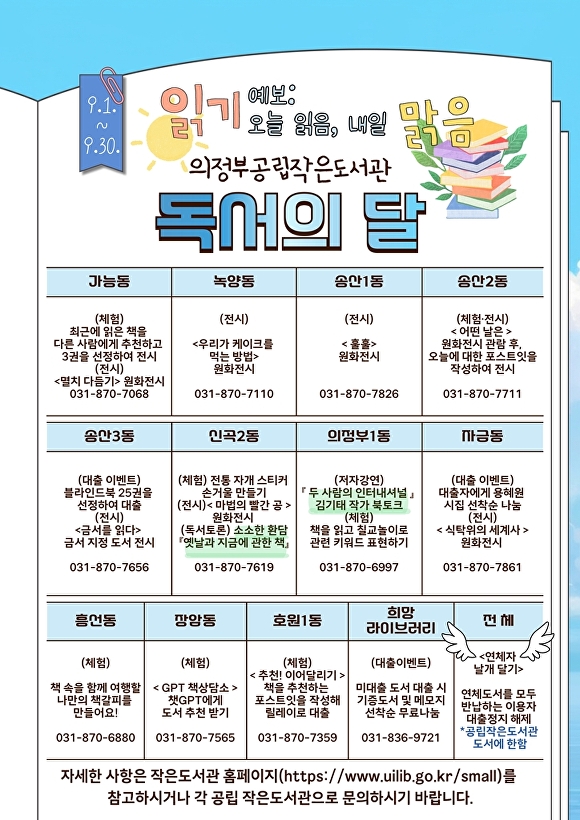 책과 함께하는 시간을 통해 더 풍요로운 하루를 꿈꾸는 9월, 의정부시의 작은도서관은 시민 누구에게나 열려 있는 독서의 장이 될 예정이다.