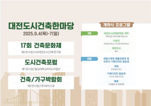 이번 행사는 대전시가 주최하고 (사)대전도시건축연구원이 주관하며, 충남대학교 RISE사업단과 ㈜마이스유가 협력한다. 개막식은 9월 5일 오후 3시 30분 DCC 제2전시장 로비에서 열린다.