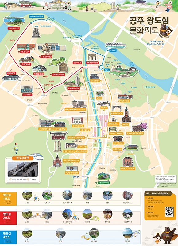 1코스(2.9㎞, 약 43분)는 공산성을 출발해 산성시장과 먹자골목, 제민천, 감영길을 거쳐 옛 공주읍사무소로 이어지며, 원도심의 역사와 일상을 동시에 체험할 수 있다.