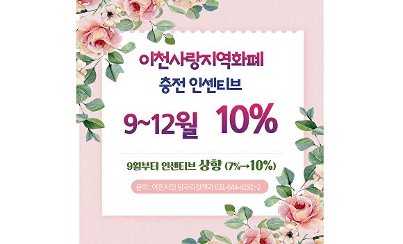 한편, 이천시는 인센티브 상향 외에도 다양한 지역화폐 소비 촉진 이벤트를 병행하고 있으며, 오는 11월에는 5차 소비지원금 지급 행사를 추진해 지역 소비 활성화와 소상공인 지원 효과를 극대화할 계획이다.